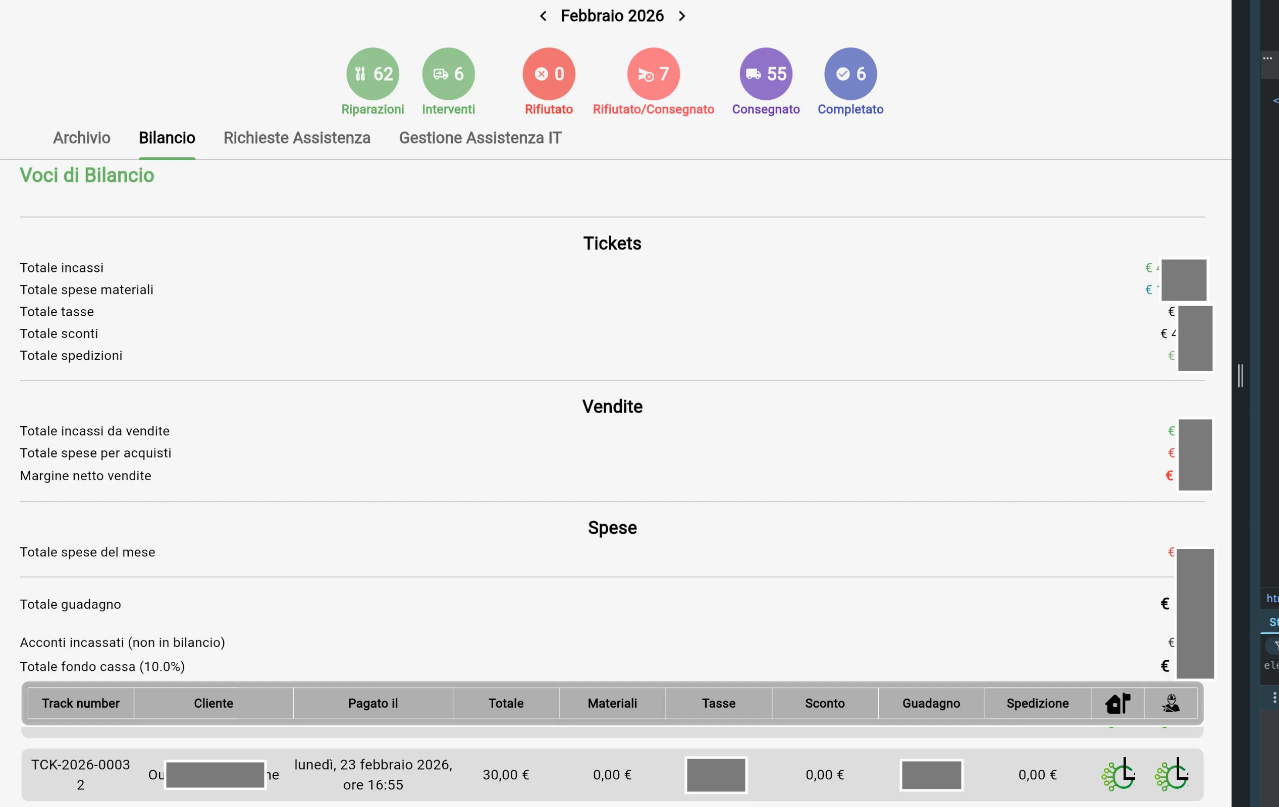 - Bilancio mensile: entrate, spese, IVA, sconti