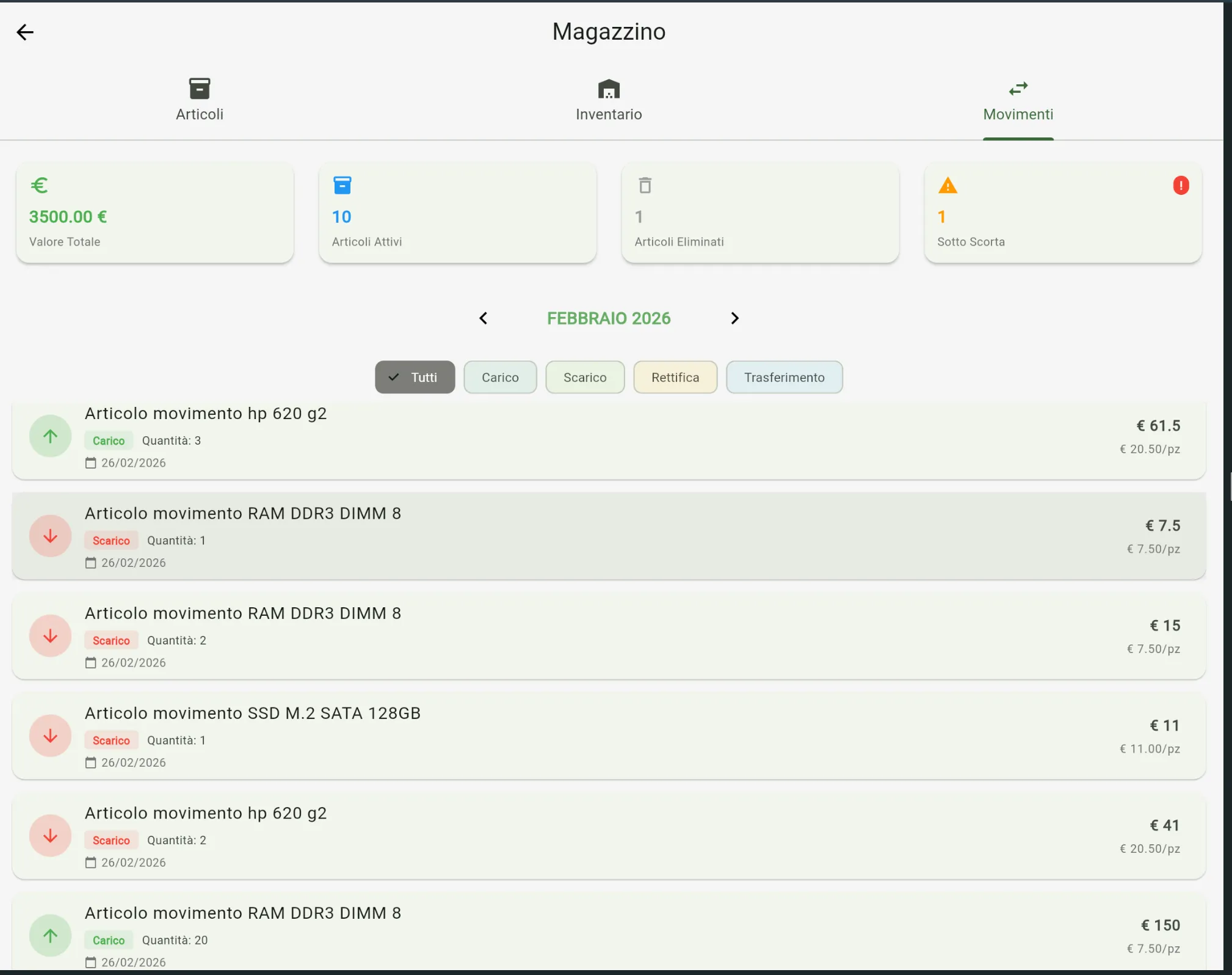 Monitora entrate, uscite e trasferimenti tra magazzini con tracciamento dettagliato.